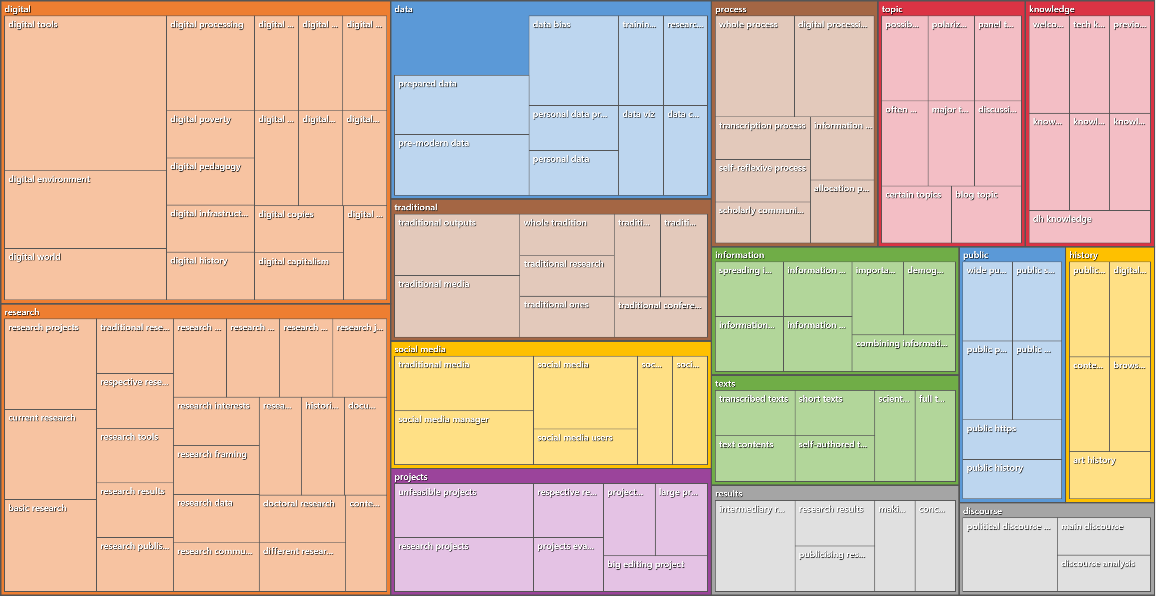 (ii) When discussing the main challenges on how to conduct digital research, participants criticized how each research community has their own standard, which is too specific to apply to research in other disciplines. This standardization makes it difficult to conduct interdisciplinary research. One main challenge is to reuse the research pipeline, or specific tasks and results that are already produced, in new research. Some participants consider it useful to present intermediary results or databases. Participants find difficult to process pre-modern data, and are confused about where to publish. While there is an advantage in “the automation of manually unfeasible projects/tasks”, participants find it hard “to assess the effort and return of processing digitally pre-modern data in a big editing project.” (Panel A2). Some participants highlighted the advantages of publishing research online, but others explained the critical aspect of securing research data, transforming information into data, and sharing it. A main concern was to define research data and the utility of providing data resources. To participants, data are often unorganized, and the research journal procedures are often trivial. In contrast, the terms of transparency and reproducibility were appropriate to characterize research data processes. The idea of sharing research process examples as models to learn from was also important. Some participants also highlighted the problem of spending too much time programming tools for the research project. The programming part, and the documentation of the research process is time consuming.